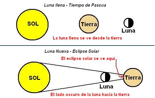 Desde la hora _____________ (como las doce del día) hubo _________________ sobre toda la _____________ hasta la hora ______________  (como las 3 p.m. de la tarde) (Mateo 27:45). ¿Qué causó esas tinieblas? Ciertamente no puede haber sido un eclipse solar, porque la Pascua se celebraba en un tiempo de luna llena y el eclipse solar solamente puede tener lugar cuando hay luna nueva, como se ilustra abajo: